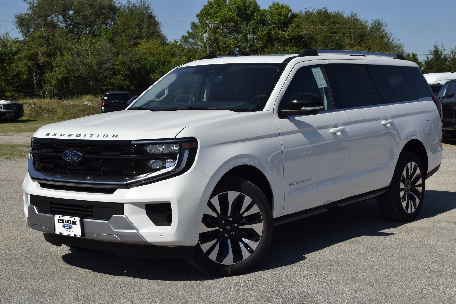 This 2025 Ford Expedition Max Platinum in Star White Metallic Tri-Coat comes with the following features: EcoBoost® 3.5L V6 GTDi DOHC 24V Twin Turbocharged 10-Speed Automatic 4WD Connectivity Package (One-Time Purchase), Driver’s Package (Continuous Control Damping Suspension, Radio: B&O Unleashed Sound System by Bang & Olufsen, and SiriusXM w/360L), 10 Speakers, 2nd Row Power-Folding Captain’s Chairs, 3.73 Axle Ratio, 3rd Row seats: split-bench, 4-Wheel Disc Brakes, ABS brakes, Adjustable pedals, Air Conditioning, Alloy wheels, AM/FM radio: SiriusXM with 360L, Apple CarPlay/Android Auto, Auto High-beam Headlights, Auto-dimming door mirrors, Auto-dimming Rear-View mirror, Automatic temperature control, BlueCruise Equipped (1-Year Plan), Brake assist, Bumpers: body-color, Compass, Delay-off headlights, Driver door bin, Driver vanity mirror, Dual front impact airbags, Dual front side impact airbags, Electronic Stability Control, Emergency communication system: 911 Assist, Exterior Parking Camera Rear, Four wheel independent suspension, Front anti-roll bar, Front Bucket Seats, Front Center Armrest, Front dual zone A/C, Front reading lights, Fully automatic headlights, Garage door transmitter, Genuine wood dashboard insert, Genuine wood door panel insert, Heated & Ventilated Leather Front Captain’s Chairs, Heated door mirrors, Heated Front Seats, Heated rear seats, Heated steering wheel, Illuminated entry, Leather steering wheel, Low tire pressure warning, Memory seat, Navigation System, Occupant sensing airbag, Outside temperature display, Overhead airbag, Overhead console, Panic alarm, Passenger door bin, Passenger vanity mirror, Pedal memory, Power door mirrors, Power driver seat, Power moonroof: Vista Roof, Power passenger seat, Power steering, Power windows, Radio data system, Radio: B&O Sound System by Bang & Olufsen, Rain sensing wipers, Rear air conditioning, Rear anti-roll bar, Rear reading lights, Rear window defroster, Rear window wiper, Reclining 3rd Row seat, Remote keyless entry, Security system, Speed control, Speed-sensing steering, Speed-Sensitive Wipers, Split folding rear seat, Spoiler, Steering wheel memory, Steering wheel mounted audio controls, Tachometer, Telescoping steering wheel, Tilt steering wheel, Traction control, Trip computer, Turn signal indicator mirrors, Variably intermittent wipers, Ventilated front seats, Voltmeter, and Wheels: 20″ Ebony Bright Machined Aluminum.