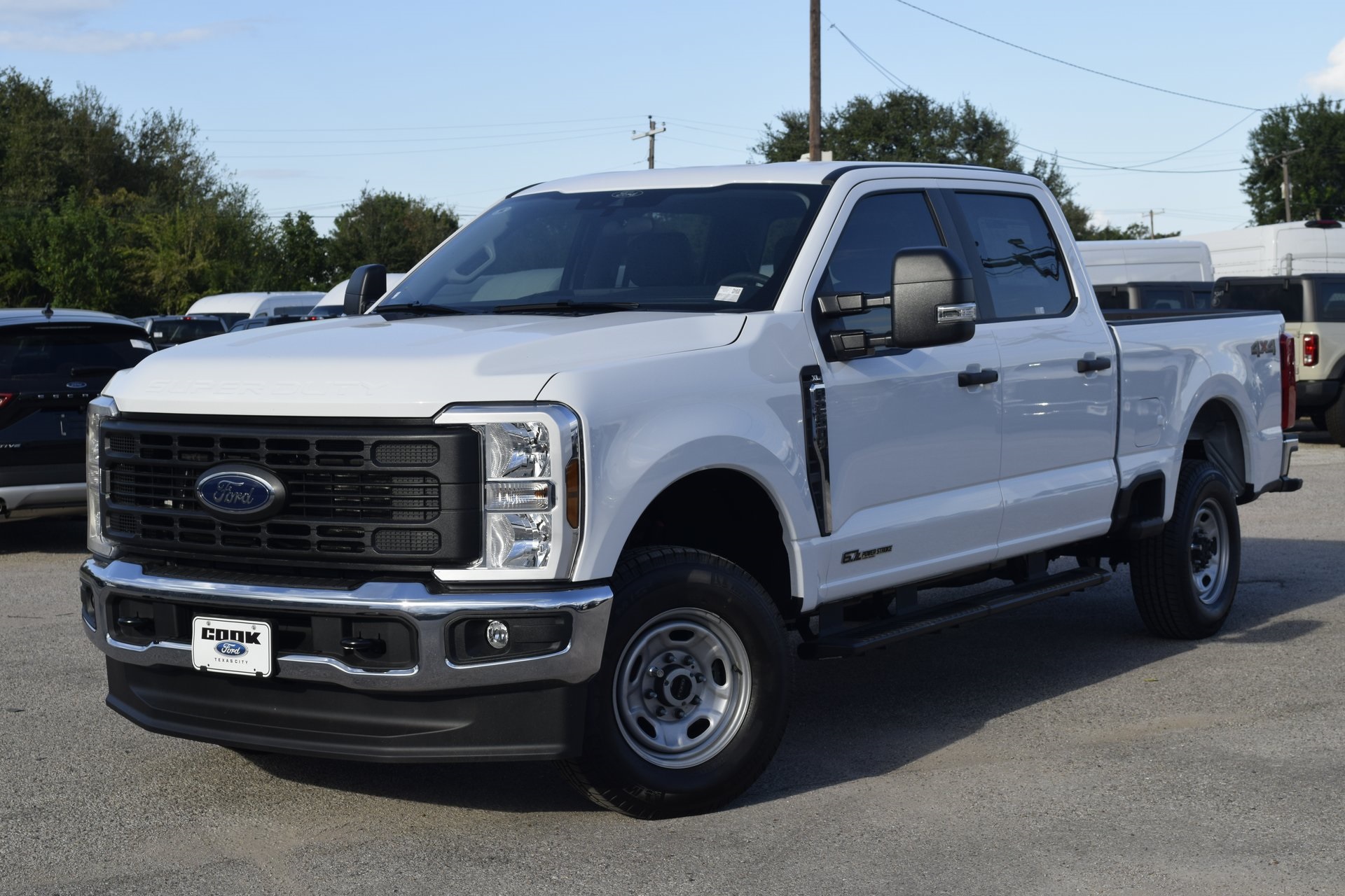 This 2026 Ford F-250SD XL in White comes with the following features: Power Stroke 6.7L V8 DI 32V OHV Turbodiesel 10-Speed Automatic 4WD Ford Connectivity Package (1-Year Included), GVWR: 10,000 lb Payload Package, Internet access capable: 5G Modem – Ford Connectivity Package, XL Chrome Package (Bright Chrome Hub Covers & Center Ornaments, Chrome Front Bumper, Chrome Rear Step Bumper, and Halogen Fog Lamps), 17″ Argent Painted Steel Wheels, 4-Wheel Disc Brakes, 400W Pro Power Onboard, 6 Speakers, ABS brakes, Air Conditioning, AM/FM radio, AM/FM Stereo w/MP3 Player, Brake assist, Compass, Delay-off headlights, Dual front impact airbags, Dual front side impact airbags, Electronic Stability Control, Emergency communication system: SYNC® 4 911 Assist, Exterior Parking Camera Rear, Front anti-roll bar, Front Center Armrest w/Storage, Front reading lights, Fully automatic headlights, HD Vinyl 40/20/40 Split Bench Seat, Heated door mirrors, Illuminated entry, Low tire pressure warning, Outside temperature display, Overhead airbag, Overhead console, Panic alarm, Passenger vanity mirror, Platform Running Boards, Power door mirrors, Power steering, Power windows, Rear reading lights, Rear step bumper, Remote keyless entry, Security system, Speed control, Split folding rear seat, Steering wheel mounted audio controls, SYNC® 4, Tachometer, Telescoping steering wheel, Tilt steering wheel, Traction control, Trailer Brake Controller, Trip computer, Turn signal indicator mirrors, Upfitter Switches (6), and Variably intermittent wipers.