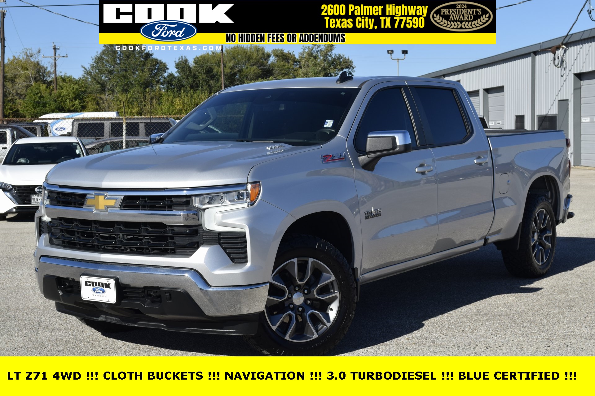 Certified. Silver Ice Metallic 2022 Chevrolet Silverado 1500 LT Texas Edition 4WD 10-Speed Automatic 3.0L I6 10-Way Power Driver Seat w/Lumbar, 12.3″ Multicolor Reconfigurable Digital Display, 120-Volt Instrument Panel Power Outlet, All-Star Edition, All-Weather Floor Liner (LPO) (AAK), Auto-Locking Rear Differential, Bluetooth® For Phone, Chevytec Spray-On Black Bedliner, Chrome Mirror Caps, Color-Keyed Carpeting Floor Covering, Compass, Convenience Package, Convenience Package II, Deep-Tinted Glass, Dual Exhaust w/Polished Outlets, Dual Rear USB Ports (Charge Only), Dual-Zone Automatic Climate Control, Electrical Steering Column Lock, Electronic Cruise Control, EZ Lift Power Lock & Release Tailgate, Front Frame-Mounted Black Recovery Hooks, Front Rubberized Vinyl Floor Mats, HD Rear Vision Camera, Heated Driver & Front Outboard Passenger Seats, Heated Power-Adjustable Outside Mirrors, Heated Steering Wheel, Heavy-Duty Air Filter, Hill Descent Control, Hitch Guidance w/Hitch View, Inside Rear-View Mirror w/Tilt, Integrated Trailer Brake Controller, Keyless Open & Start, Leather Wrapped Steering Wheel, LED Cargo Area Lighting, Manual Tilt/Telescoping Steering Column, Off-Road Suspension, OnStar & Chevrolet Connected Services Capable, Power Front Windows w/Driver Express Up/Down, Power Front Windows w/Passenger Express Down, Power Rear Windows w/Express Down, Power Sliding Rear Window w/Rear Defogger, Preferred Equipment Group 1LT, Protection Package, Rear 60/40 Folding Bench Seat (Folds Up), Rear Rubberized-Vinyl Floor Mats, Rear Wheelhouse Liners, Remote Start Package, SiriusXM w/360L, Standard Suspension Package, Standard Tailgate, Steering Wheel Audio Controls, Texas Edition Badging, Texas Edition Plus, Trailering App, Trailering Package, Universal Home Remote, Wheels: 18″ x 8.5″ Bright Silver Painted Aluminum, Wheels: 20″ x 9″ Painted Aluminum, Wireless Phone Projection, Z71 Off-Road & Protection Package, Z71 Off-Road Package.